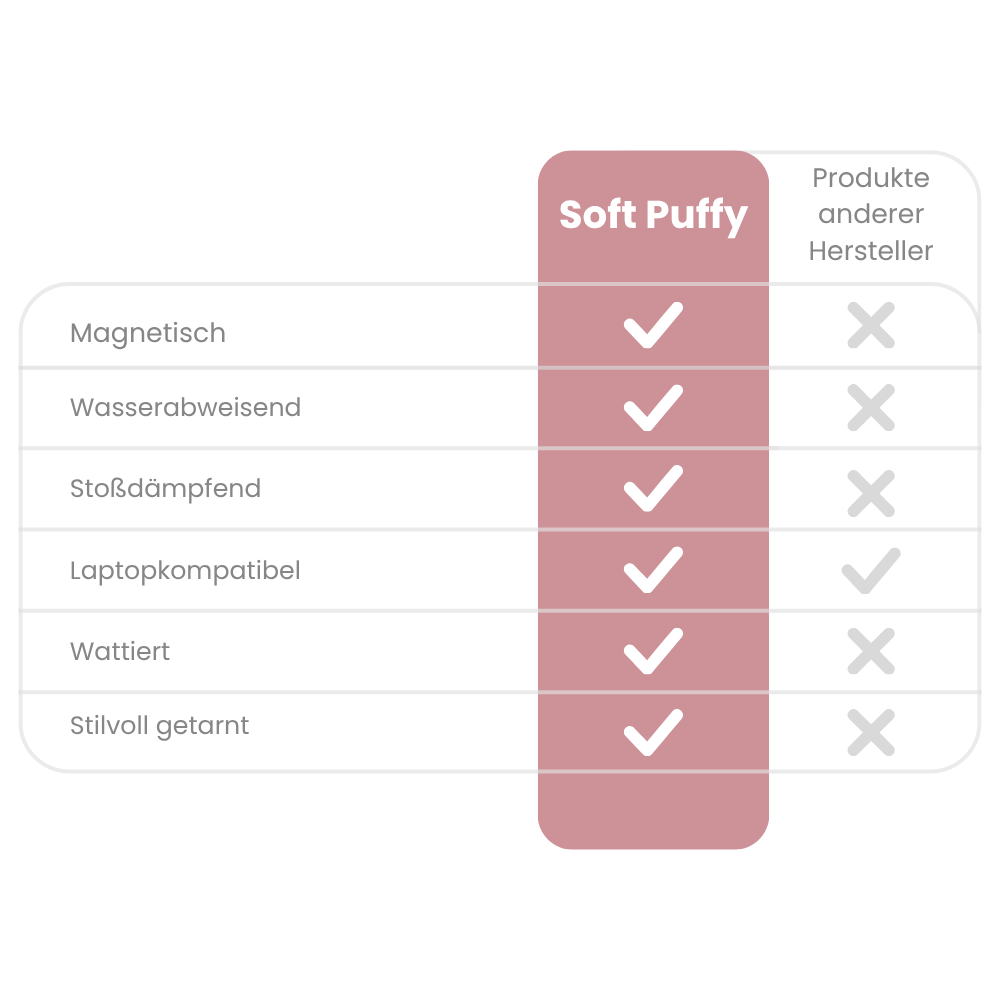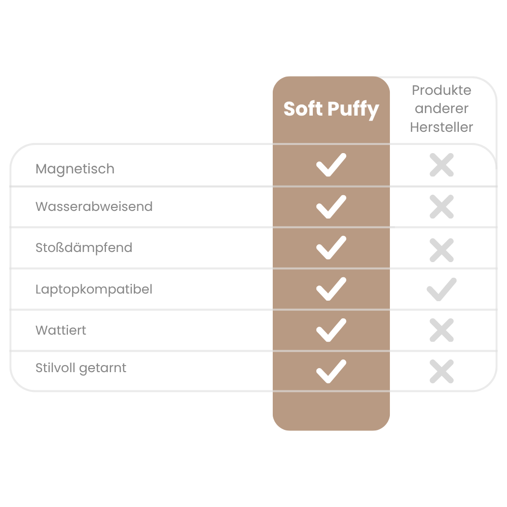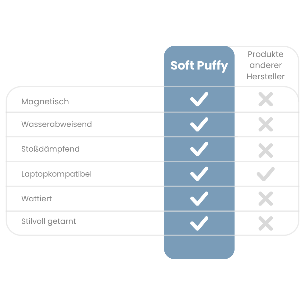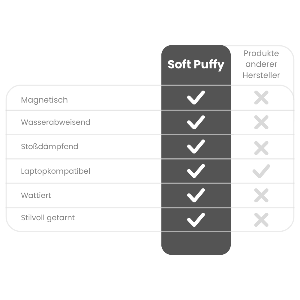Die Soft Puffy ist ein stylisches Lifestyle-Accessoire mit zuverlässigem Schutz: smarter Magnetverschluss statt hakender Reißverschlüsse, stoßdämpfende Polsterung und wasserabweisendes Material. Minimalistisch im Look, federleicht im Alltag – passt zu jedem Outfit und in jede Situation.